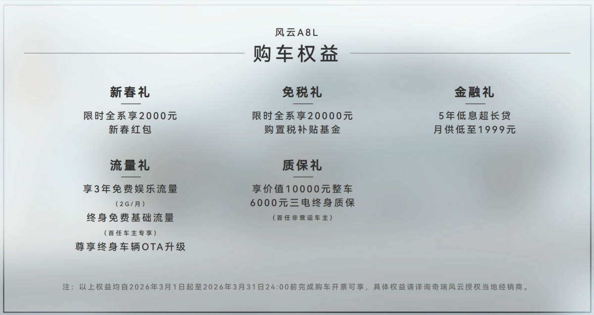 2026年3月,奇瑞风云A8L携重磅购车权益强势来袭。限时全系享20000元
