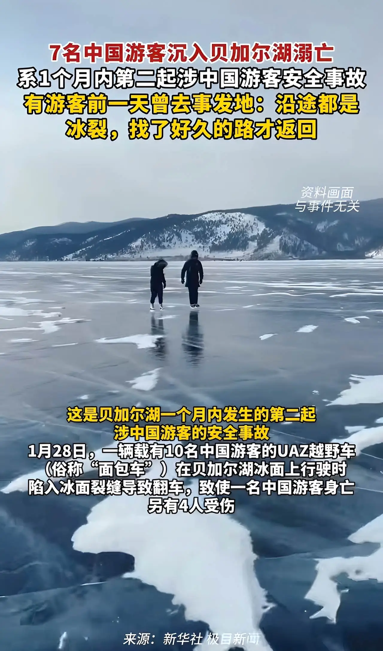 贝加尔湖的蓝冰每年都吸引着无数游客前往,那梦幻般的景色背后,却潜藏着足以吞噬生命的巨大隐患。2月20日,俄罗斯贝加尔湖发生了一起令人痛心的旅游车辆坠湖事件,一辆载有8人的游览车冲破冰层沉入湖底,最终导致1名俄罗斯司机和7名中国游客不幸遇难,仅1人侥幸逃生。冰冷的水面下,是7个戛然而止的生命,更是无数个破碎的家庭,这起悲剧用血的代价再次敲响了旅游安全的警钟。