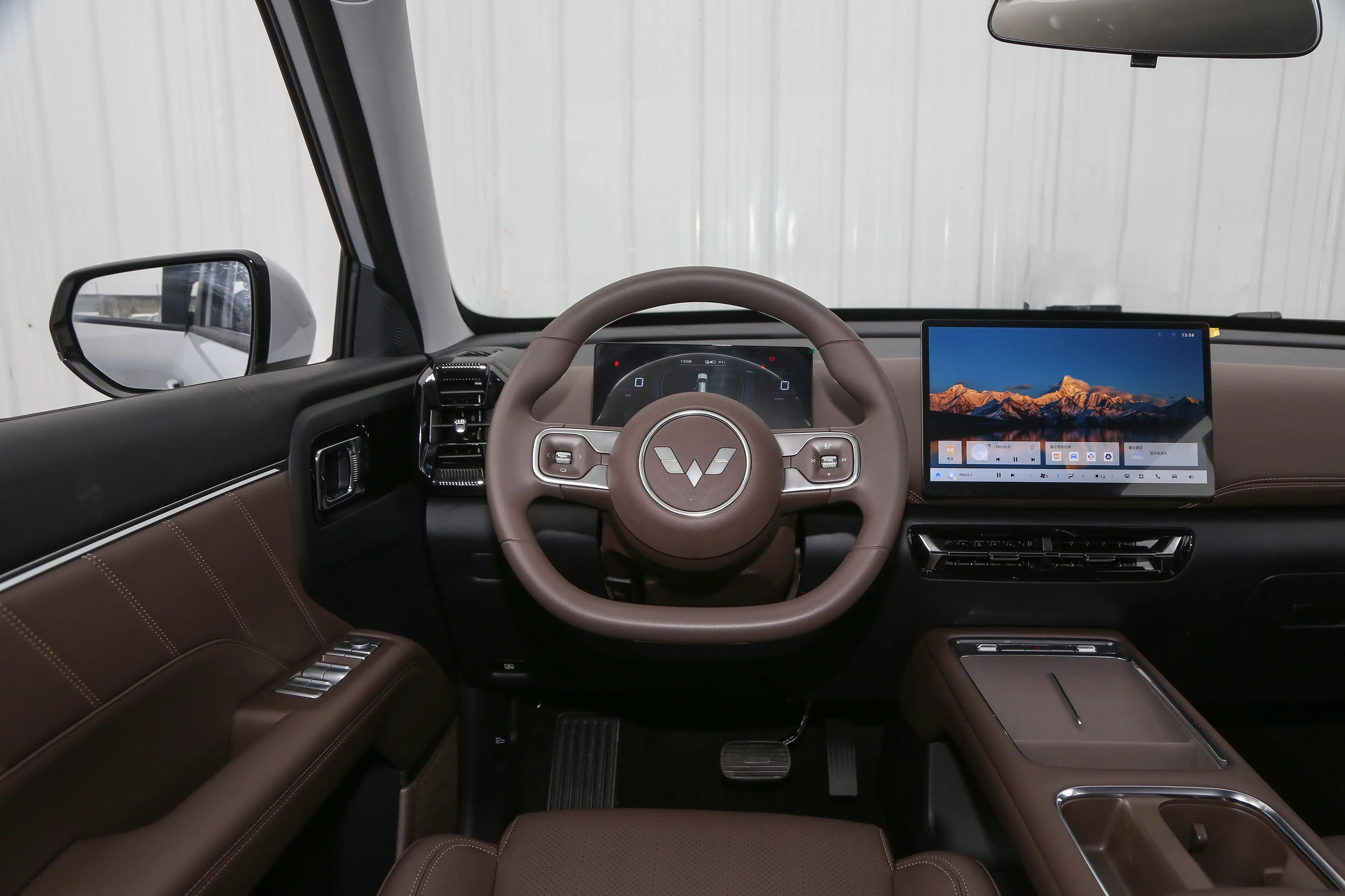 坐进车内,胡桃棕的内饰配色(可选暖沙棕)瞬间带来温馨的家用氛围,环抱式座舱设计让驾乘者更有包裹感。虽然受制于定价,内饰部分区域采用硬塑料材质,但做工规整,拼接处缝隙均匀,并无明显廉价感。12.8英寸悬浮式中控屏是内饰的核心亮点,搭配3.5英寸液晶组合仪表,信息显示清晰直观。车机系统搭载五菱Ling OS 2.0,语音识别响应速度快至0.6秒,支持连续对话和多方言识别,“打开空调”“调节音量”等基础指令都能精准执行。同时支持支持HUAWEl HiCar/CarLink手机互联映射和OTA升级,虽然没有过多花哨功能,但稳定性和实用性拉满,对于家庭用户来说完全够用。