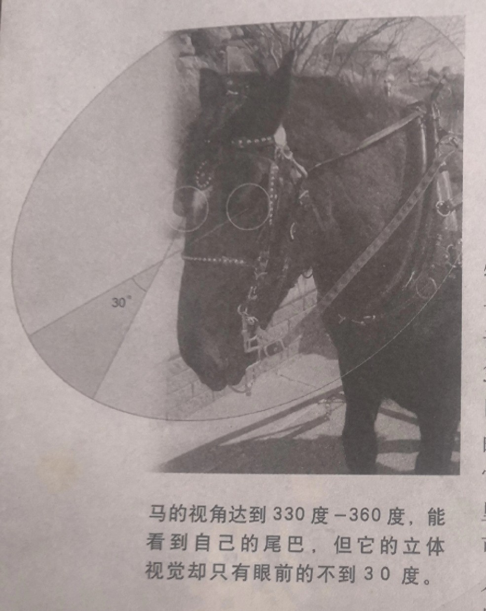 展板上列出了马的一些生理特点和习性。马生性胆小,其中的一个原因就是它们的视力不好。讲解员说,马的视角很大,达到330度﹣360度,能看到自己的尾巴,但它的立体视觉却只有眼前的不到30度。当人或其它动物从它们身后接近时,它们在马的眼里都是放大而模糊不清的,马很可能把这个影像视为危险。所以,人们在接触马时切不可从它们身后摸马屁股或后半身,以免横遭铁蹄的踢打。要接近马,最好从正面或斜侧面靠近,抚摸它的脸颊或脖颈,这时它便知道你在向它表示友好。