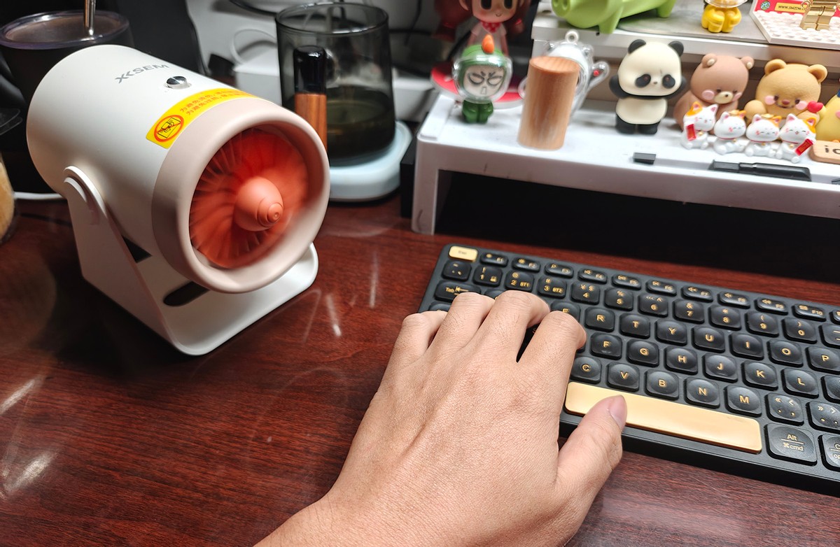 当然我用的最多的还是吹手,只需要把西圣桌面暖风机放在键盘的一侧,对着手吹风就行了,只要不是正对着手吹,就不会觉得烫手,让风从手上放吹过,还可以照顾到另一边用鼠标的右手,这样双手就都暖和了。