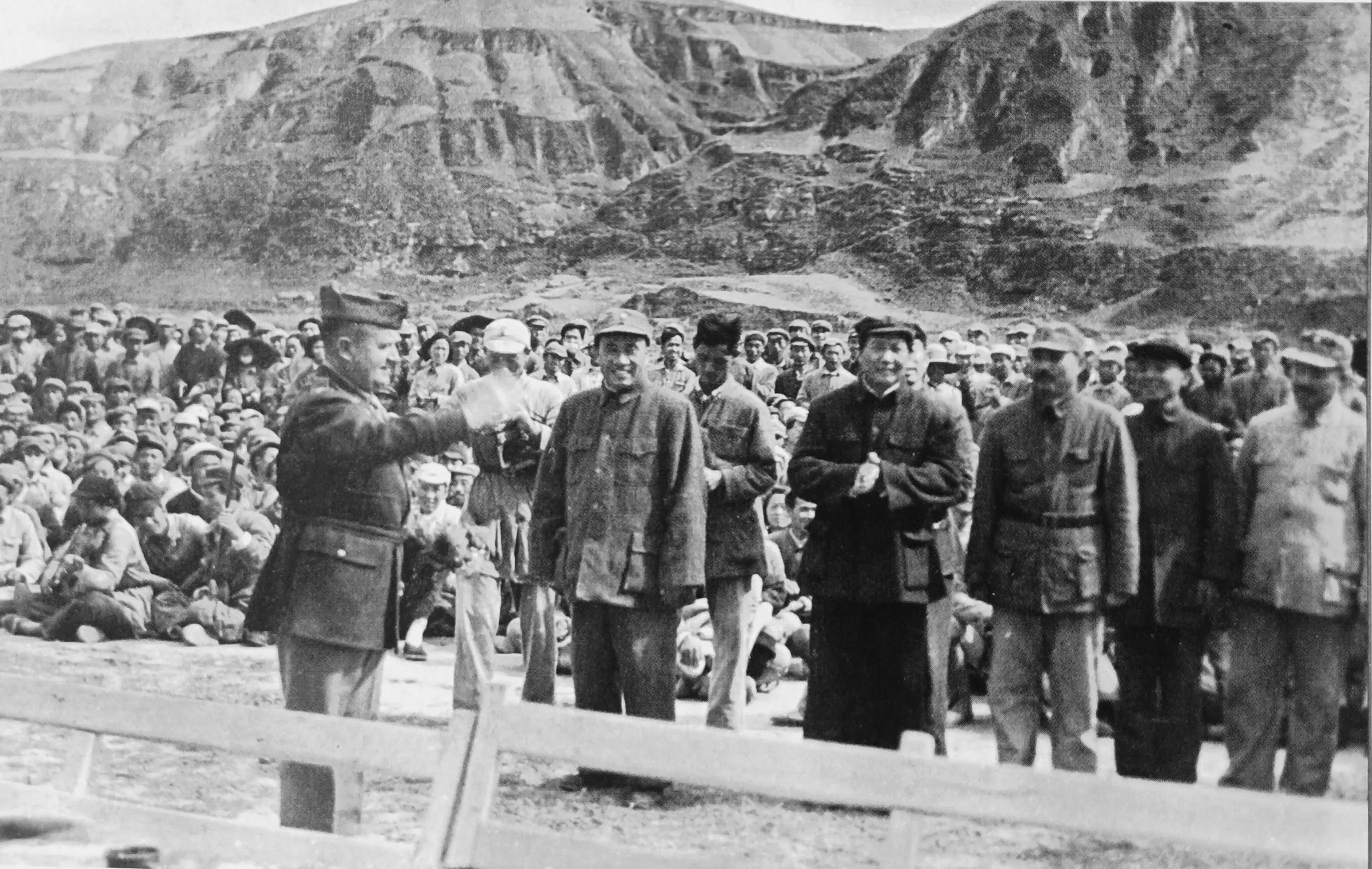 1944年10月,毛泽东等出席美军中缅印战区统帅部授予美军观察组组长包瑞德勋章的仪式。前排左起:包瑞德、朱德、毛泽东、叶剑英、杨尚昆、贺龙。