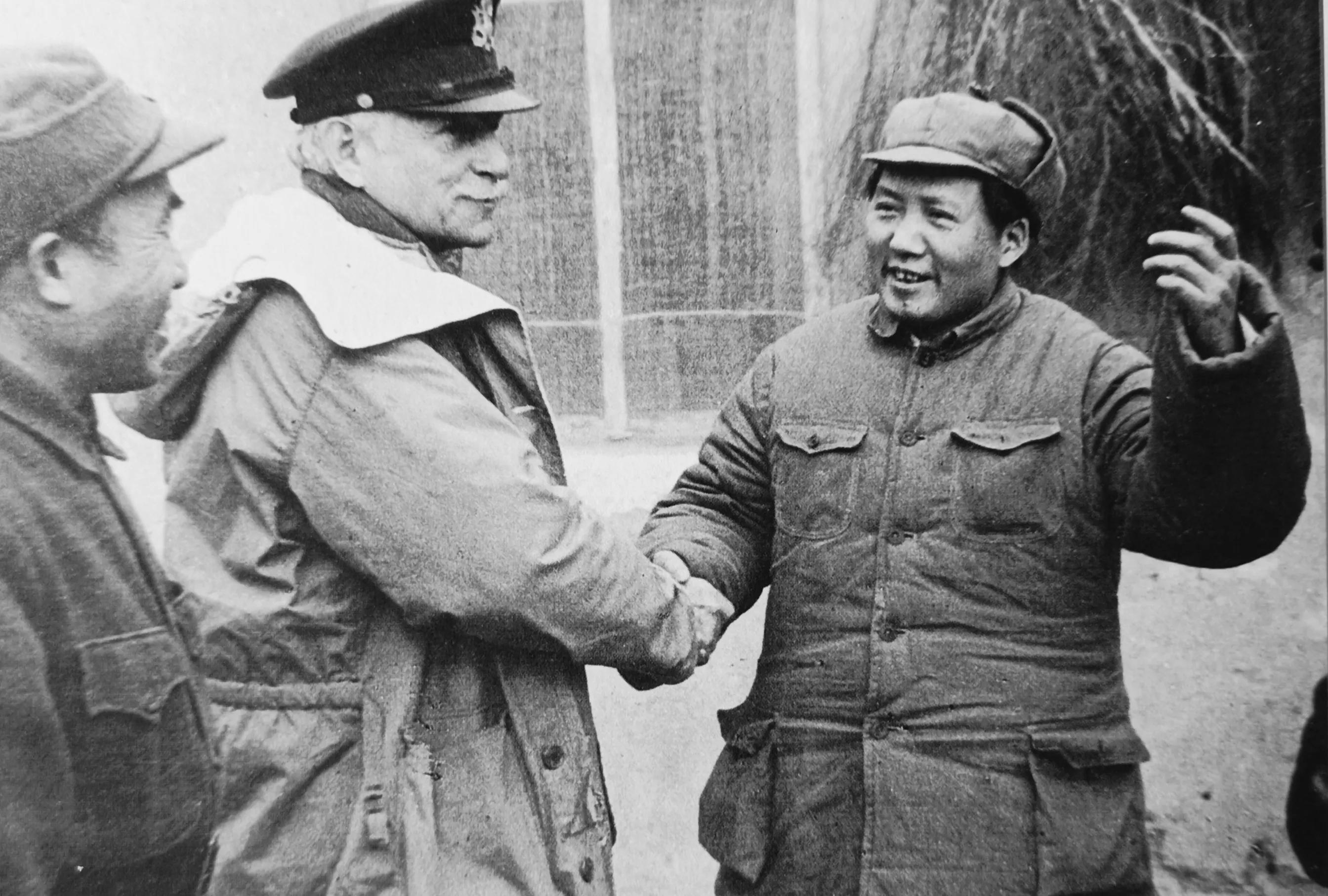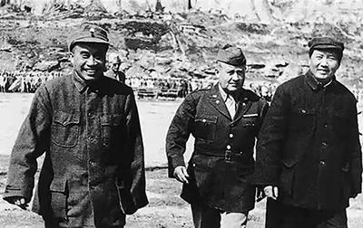 1944年11月,美军观察组组长包瑞德上校(中)与毛泽东主席(右一)、朱德总司令(左一)在一起。