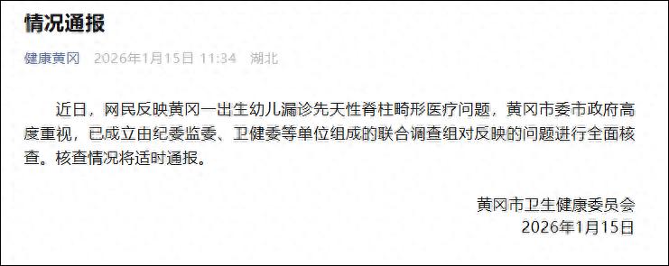 2026年1月15日,黄冈市卫生健康委员会发布情况通报称,对于网民反映黄冈一出生幼儿漏诊先天性脊柱畸形医疗问题,黄冈市委市政府高度重视,已成立由纪委监委、卫健委等单位组成的联合调查组对反映的问题进行全面核查。核查情况将适时通报。