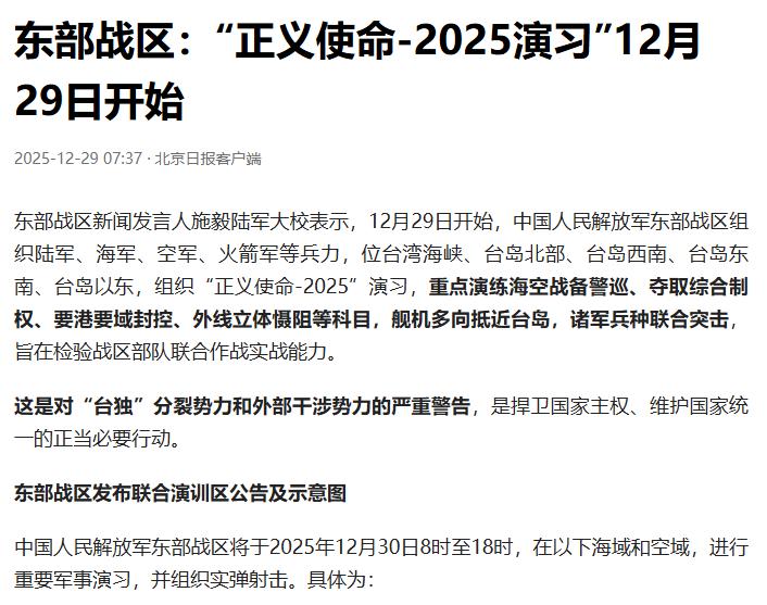 实战化演训根据东部战区官方发布的信息,12月29日清晨,“正义使命-2025”演训正式启动,陆军、海军、空军、火箭军等主力部队悉数参演,在台湾海峡及我国台湾岛周边多个关键方向同步展开行动。