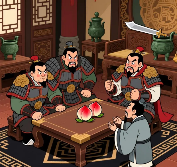 一天,鲁昭公来齐国访问。齐景公设宴招待他。鲁国是叔孙婼[ruò]执行礼仪,齐国是晏子执行礼仪。君臣四人坐在堂上。“三杰”佩剑立于堂下,态度十分傲慢。正当两位国君喝得半醉的时候,晏子说:“园中的金桃已经熟了,摘几个来请二位国君尝尝新吧!”齐景公传令派人去摘。晏子说:“金桃很难得,我应当亲自去摘。”不一会儿,晏子领着园吏,端着玉盘献上六枚桃子,每个桃都有碗口大,色泽鲜美,香气扑鼻。景公问:“就结这几个吗?”晏子说:“还有几个,没太熟,只摘了这六个。”说完就恭恭敬敬地献给鲁昭公、齐景公每人一个金桃。鲁昭公边吃边夸奖金桃味道甘美。齐景公说:“这金桃不容易得到,叔孙大夫天下闻名,应该吃一个。”叔孙婼谦让道:“我哪里赶得上晏相国呢!相国协助君王管理国政,功绩卓著,诸侯佩服,这个桃应当请相国吃。”齐景公说:“既然叔孙大夫推让相国,就请你们二位每人吃一个金桃吧。”两位大臣谢过景公。晏子说:“盘中还剩下两个金桃,请君王传令各位臣子,让他们都说一说自己的功劳,谁功劳大,就赏给谁吃。”齐景公说:“这样很好。”便传下令去。话音未落,公孙捷走了过来,得意洋洋地说:“我曾跟着主公上山打猎,忽然一只吊睛大虎向主公扑来,我用尽全力将老虎打死,救了主公性命,如此大功,还不该吃个桃吗?”晏子说:“冒死救主,功比泰山,应该吃一个桃。”公孙捷接过桃子就走。古冶子喊道:“打死一只虎有什么稀奇!我护送主公过黄河的时候,有一只老鼋[yuán,即鳖]咬住了主公的马腿,一下子就把马拖到急流中去了。我跳到河里把老鼋杀死,救了主公,像这样大的功劳,该不该吃个桃?”景公说:“那时候黄河波涛汹涌,要不是将军斩鼋除怪,我的命就保不住了,这是盖世奇功,理应吃个桃。”晏子急忙送给古冶子一个金桃。