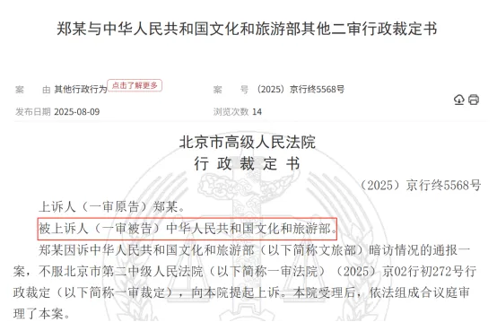 8月9日,北京市高级人民法院发布了一则罕见的判决文书。原告是一位名为“郑某”的自然人,而被告是中国文化和旅游部。