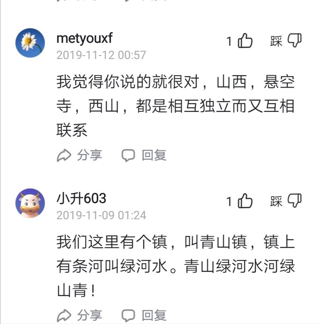 一个网友说:我们这里有个镇,叫青山镇,镇上有条河叫绿河水。所以他对的下联是“青山绿河水河绿山青”。