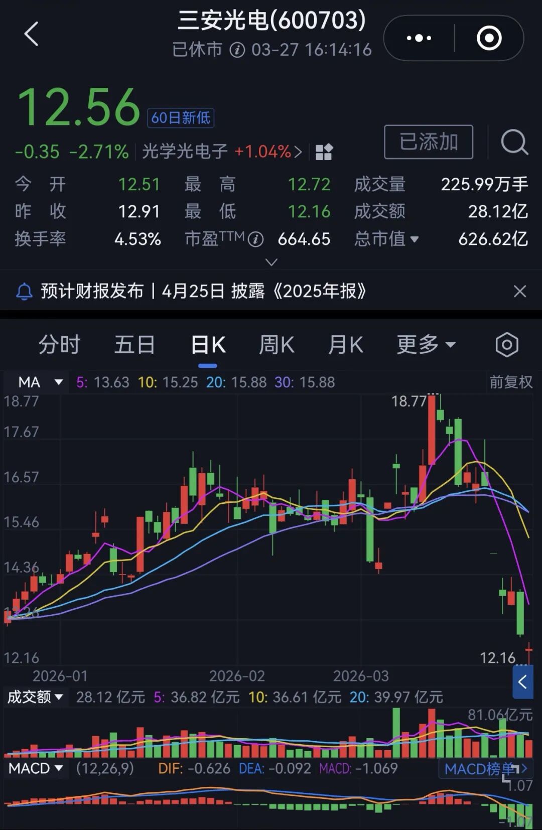 这一消息公布后,三安光电股价大幅下跌。从3月20日的最高点17.66元一路跌至上周五收盘的12.56元,股价一周大跌超5元。