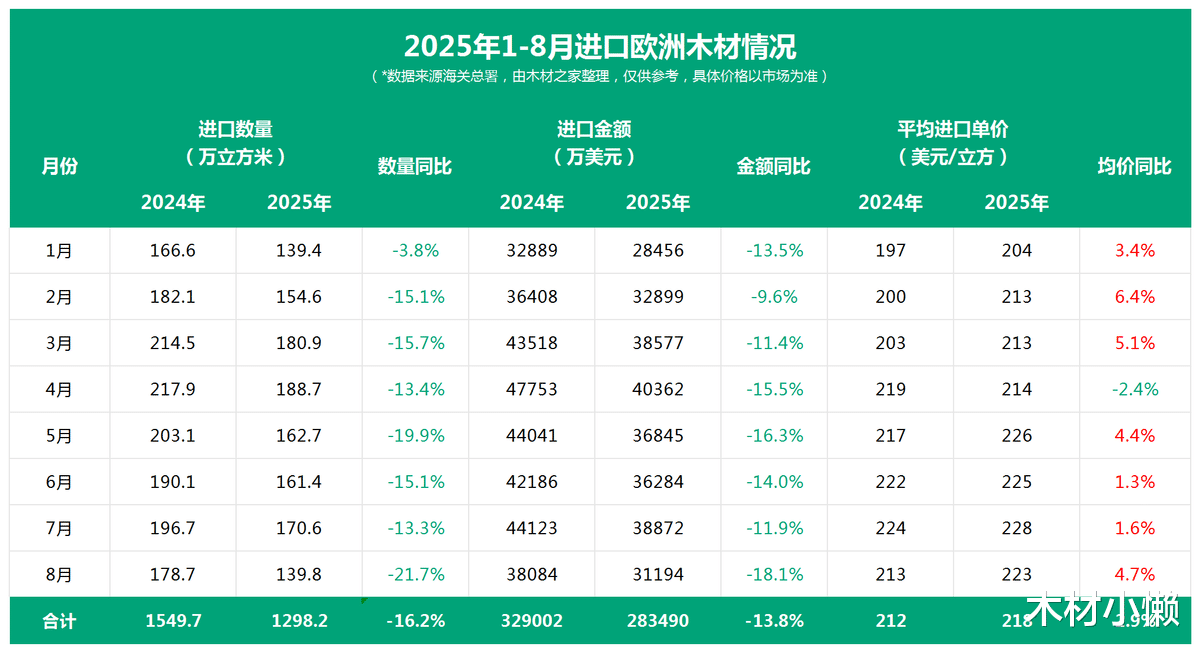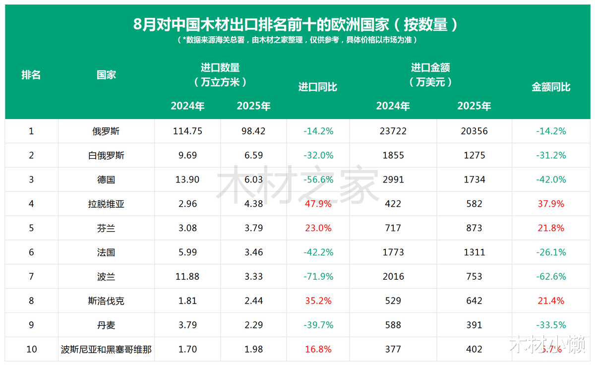 海关数据显示,2025年8月,中国自欧洲(包含俄罗斯、白俄罗斯)进口的木材数量为139.8万立方,同比减少21.7%,环比7月下降18%;对应进口金额为3.12亿美元,同比下降18.1%。8月平均进口单价同比增长4.7%。