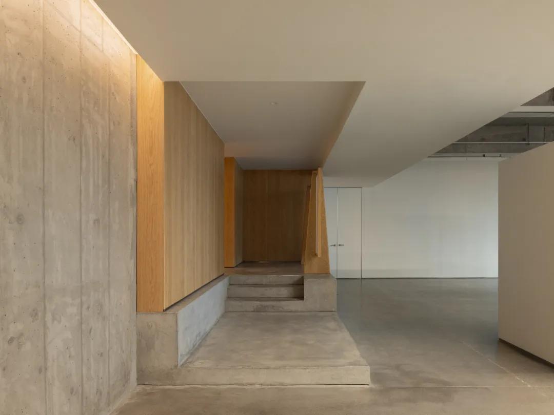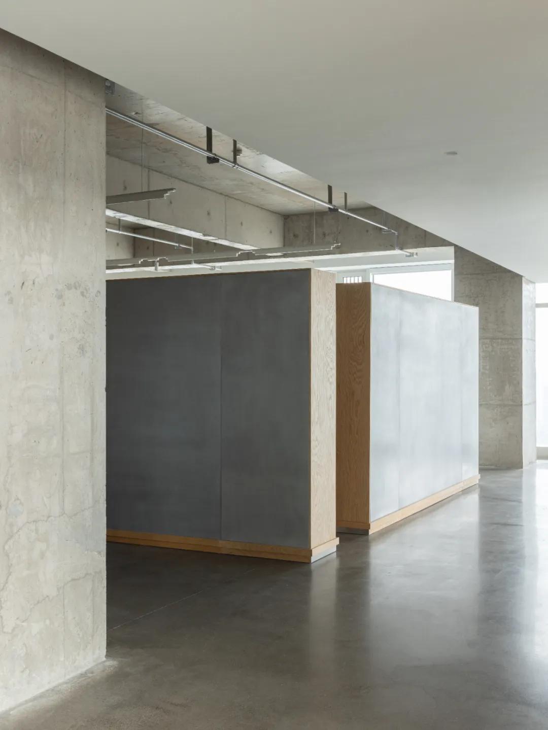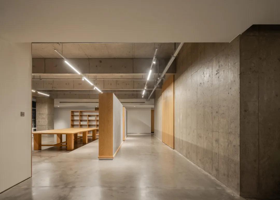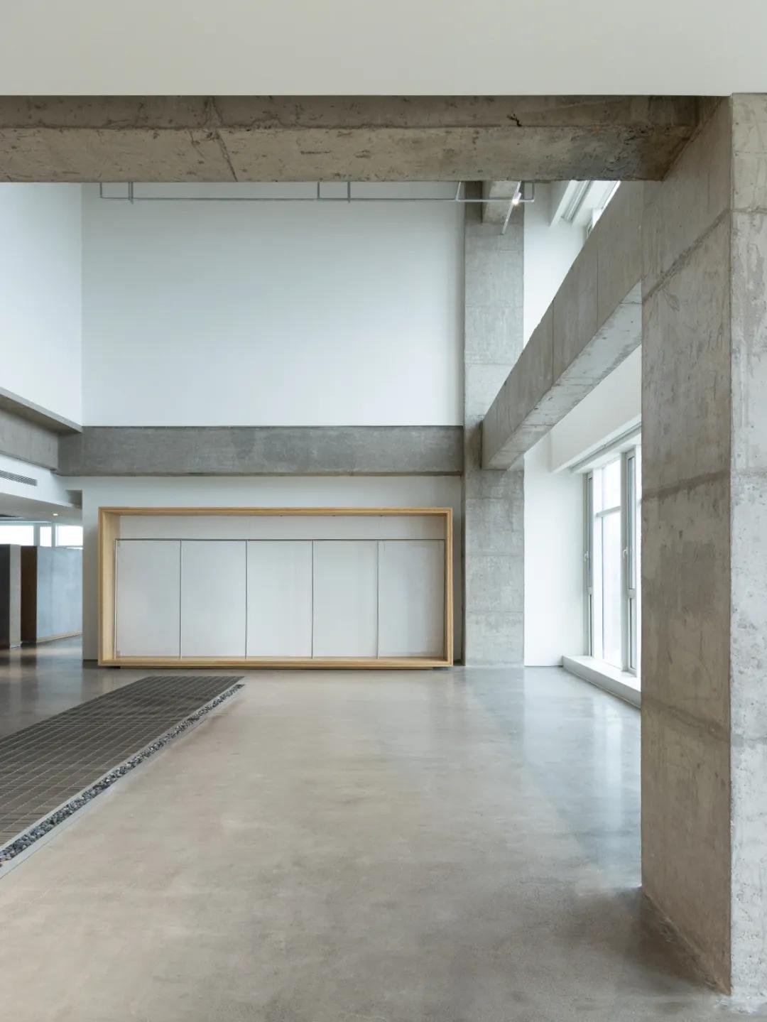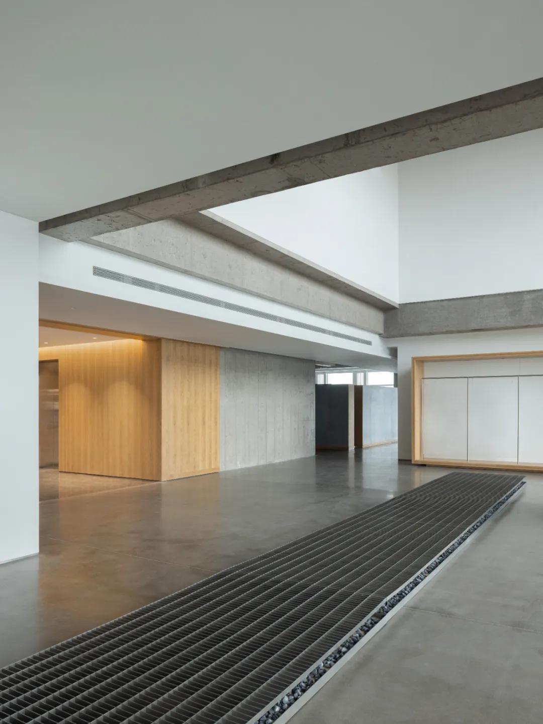 以“走廊”为介质,在公共展厅与私人办公空间之间构建了一个轻柔的缓冲地带。不仅是动线连接,由此衍生出多元化的功能布局,并通过材料从粗粝到精细的递变分布,完成“展厅”到“办公”的功能转变。