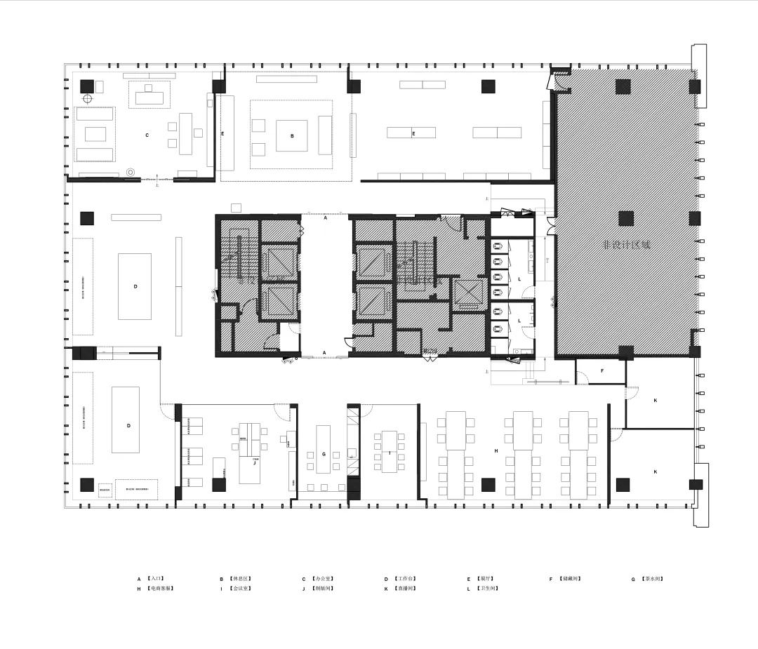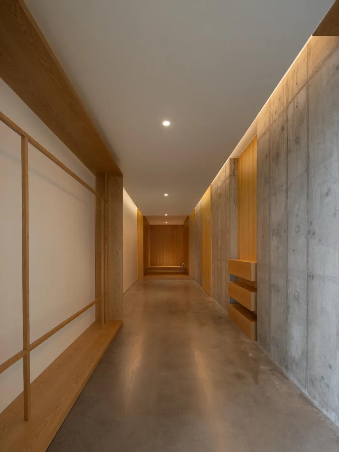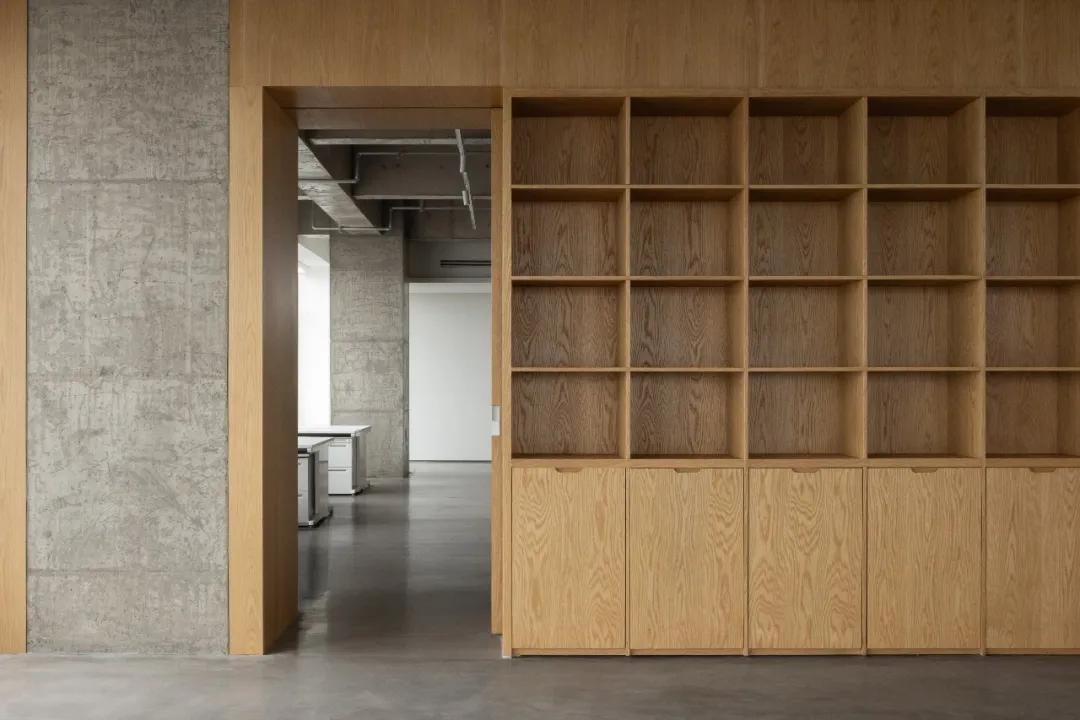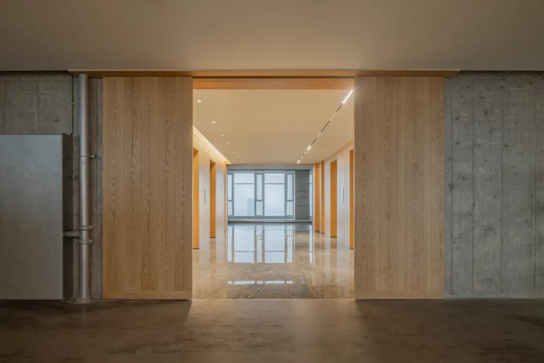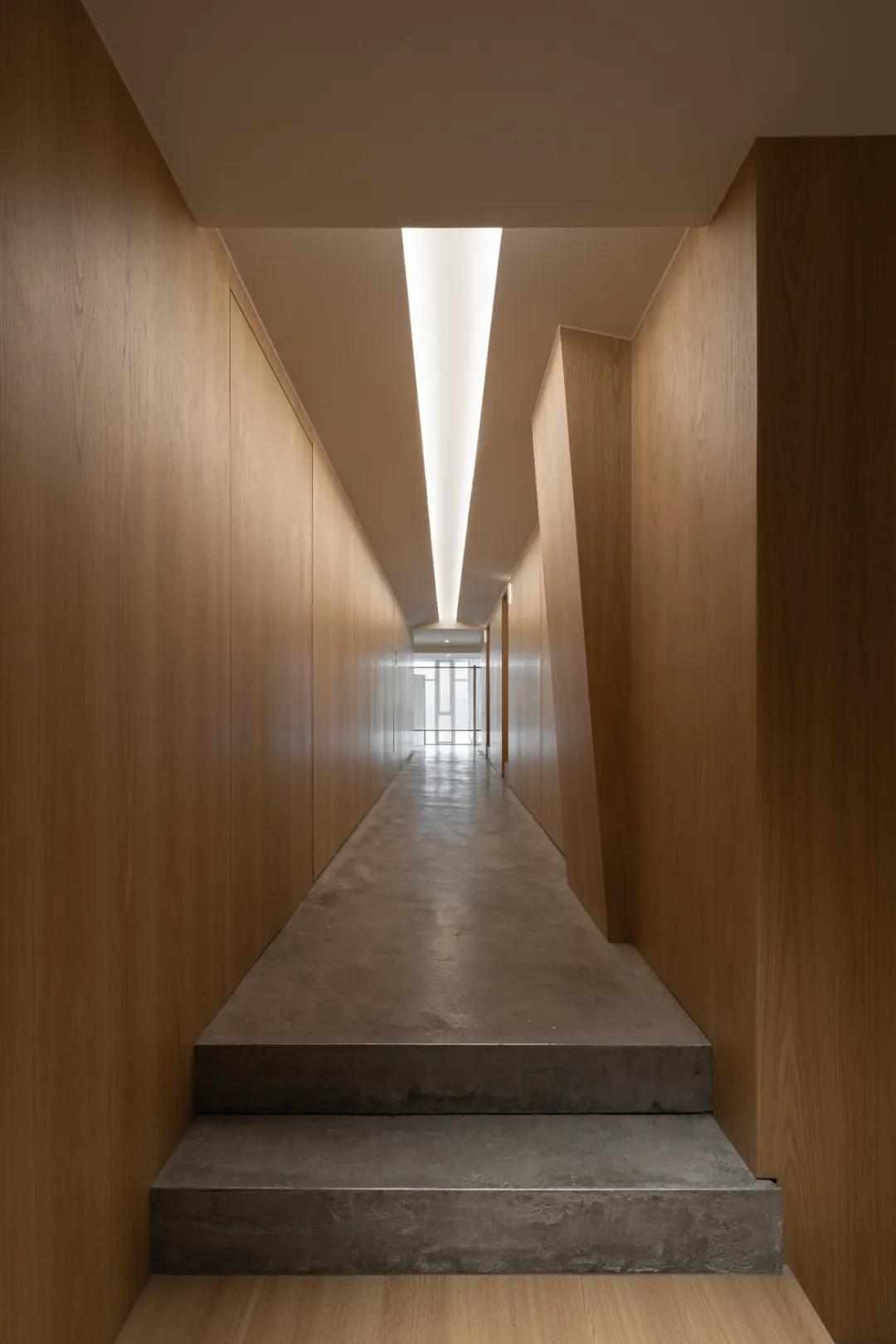 由“回”入“廊”,空间功能由外部的策略展转化为向内的协作,材质依据发生平滑的倒置,大面积木材的介入消除了狭长空间立体感,利用生物亲和力构建起温润的心理,使公共办公与通道空间在连续的稠度肌理中达成一种顺应万象的流动与平衡;