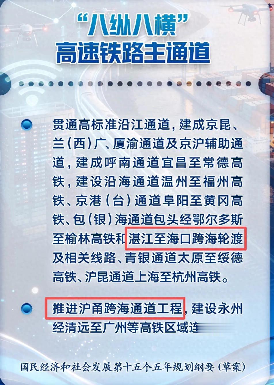 国家“十五五”规划纲要草案提出,基本建成“八纵八横”高速铁路主通道,推进沪甬跨海通道工程。