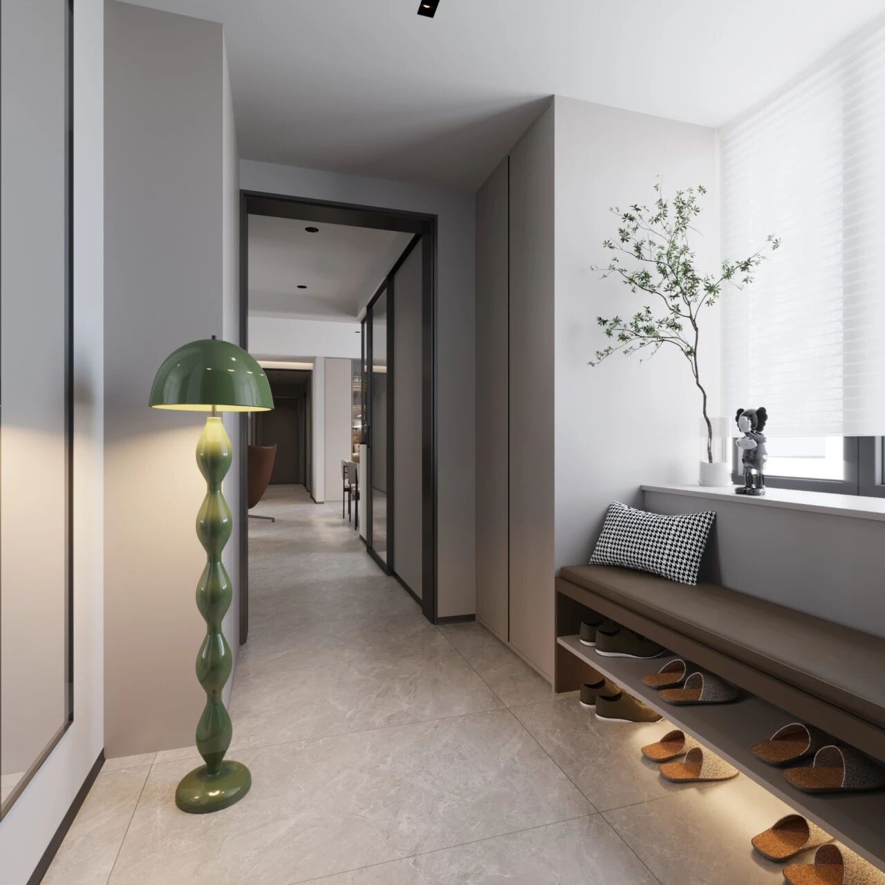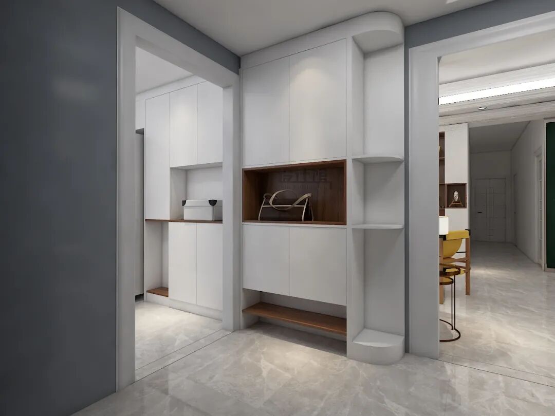 玄关是过渡区,其设计核心是“效率”。鞋柜使用方便,在鞋柜底部做1-2层的留空——进出门→换鞋,鞋子触手可及,动作一气呵成,是保障玄关持续整洁、避免鞋子堆积的关键。