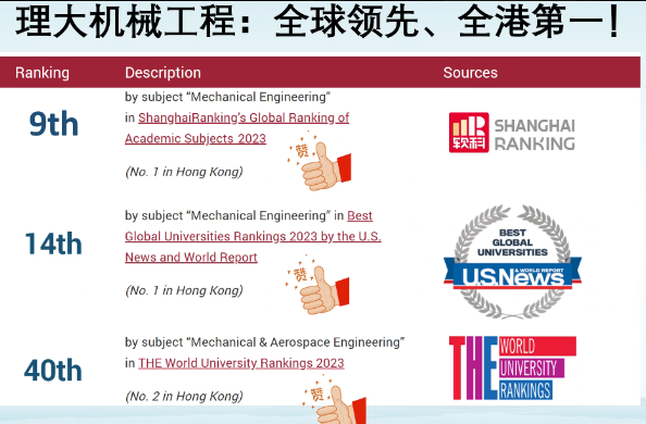 雄厚之实力:香港理工大学在机械工程专业排名位列全港第一、全球第9位,实力卓越,成绩斐然!