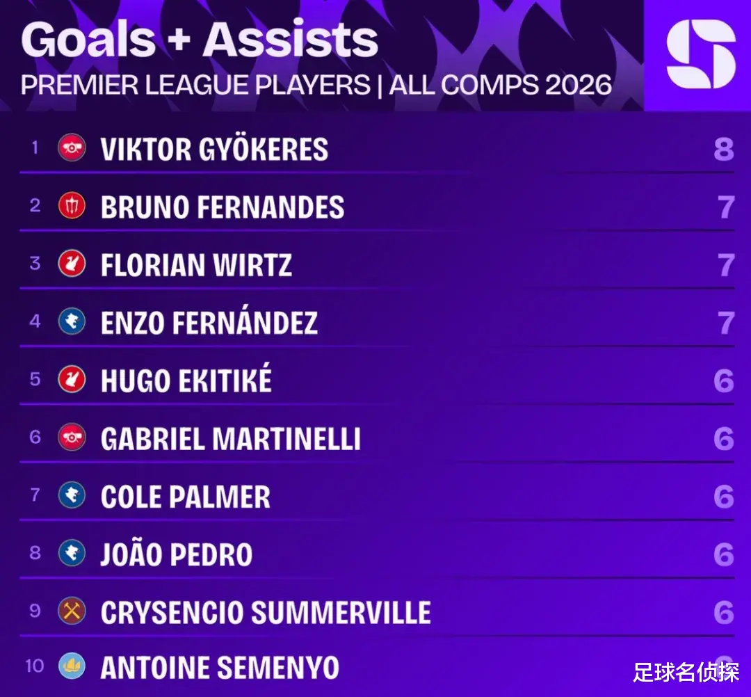 自2026年以来,哲凯赖什已经在各项赛事贡献6球2助攻,是同期所有英超球员中各项赛事参与进球数最多的(曼城和利物浦比赛开打前)。