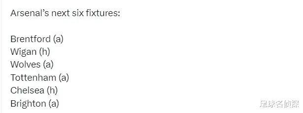阿森纳未来6场比赛:客战布伦特福德、主战维冈、客战狼队、客战热刺、主战切尔西、客战布莱顿。