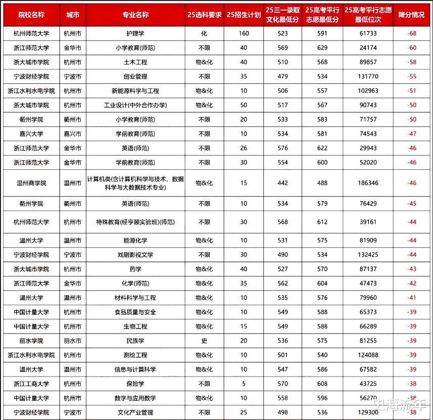 戏剧影视文学和民族学作为小众专业,就业渠道狭窄,前者多集中于传媒、影视行业,岗位总量少,后者多流向科研或民族相关领域,适配岗位稀缺,且这类专业难吸引高分考生,最终拉低录取分数线。此外 2025 年浙江特控线下降3分,为这些专业分数线的下移提供了整体空间,进一步放大了降分幅度。