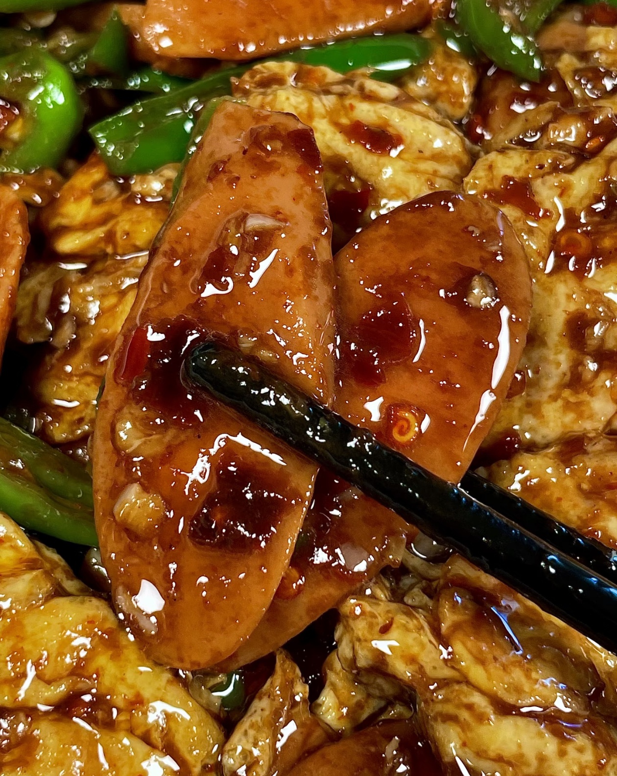 接下来把之前炒好的鸡蛋倒回锅中,和火腿、青椒一起翻炒均匀,让鸡蛋吸收锅里的油脂和香气,然后倒入提前调好的万能酱汁,转大火快速翻炒,让每一块鸡蛋、每一片火腿都均匀裹上酱汁,炒到汤汁微微浓稠,均匀挂在所有食材上就可以关火出锅了。炒的时候一定要开大火,快速收汁,这样酱汁才能牢牢挂在食材上,吃起来每一口都带着浓郁的酱香,鸡蛋软嫩入味,火腿咸香焦脆,青椒爽脆提味,三种食材的味道完美融合,没有多余的调料,却把家常的香气发挥到了极致。