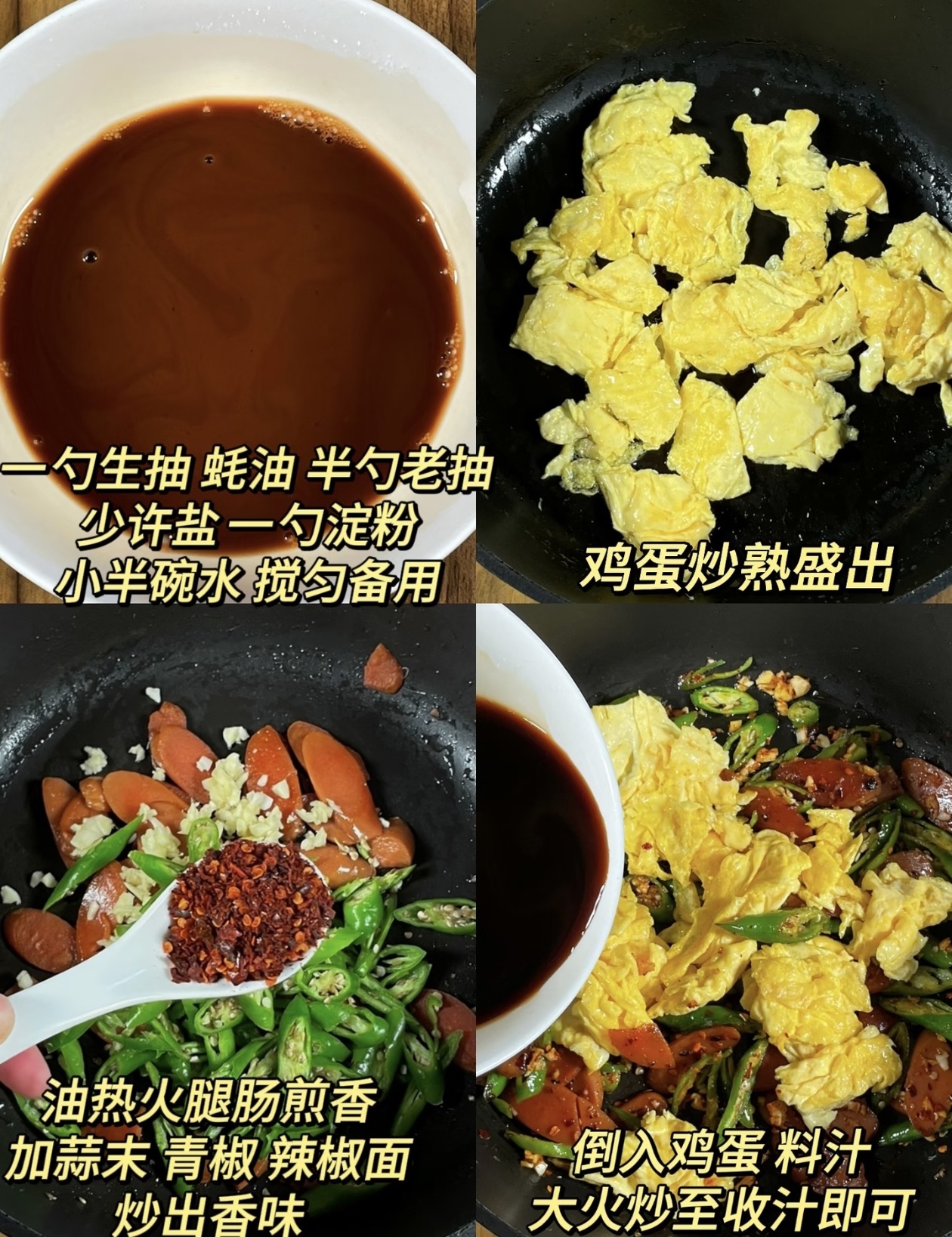 先准备好所有食材和万能酱汁,这可是这道菜好吃的关键。取一个小碗,加入一勺生抽、一勺蚝油,再放半勺老抽上色,加少许盐调味,接着放入一勺淀粉,倒入小半碗清水,用筷子充分搅拌均匀,让所有调料和淀粉完全化开,这样调出来的酱汁,炒的时候能均匀挂在食材上,出锅后自带浓郁的芡汁,不会寡淡也不会结块。接下来处理食材,两个鸡蛋打入碗中,加少许盐搅散备用;火腿肠斜切成薄片,青椒洗净后切成段,再准备几瓣大蒜切成蒜末,喜欢吃辣的可以额外准备一勺辣椒面,增香又提味。
