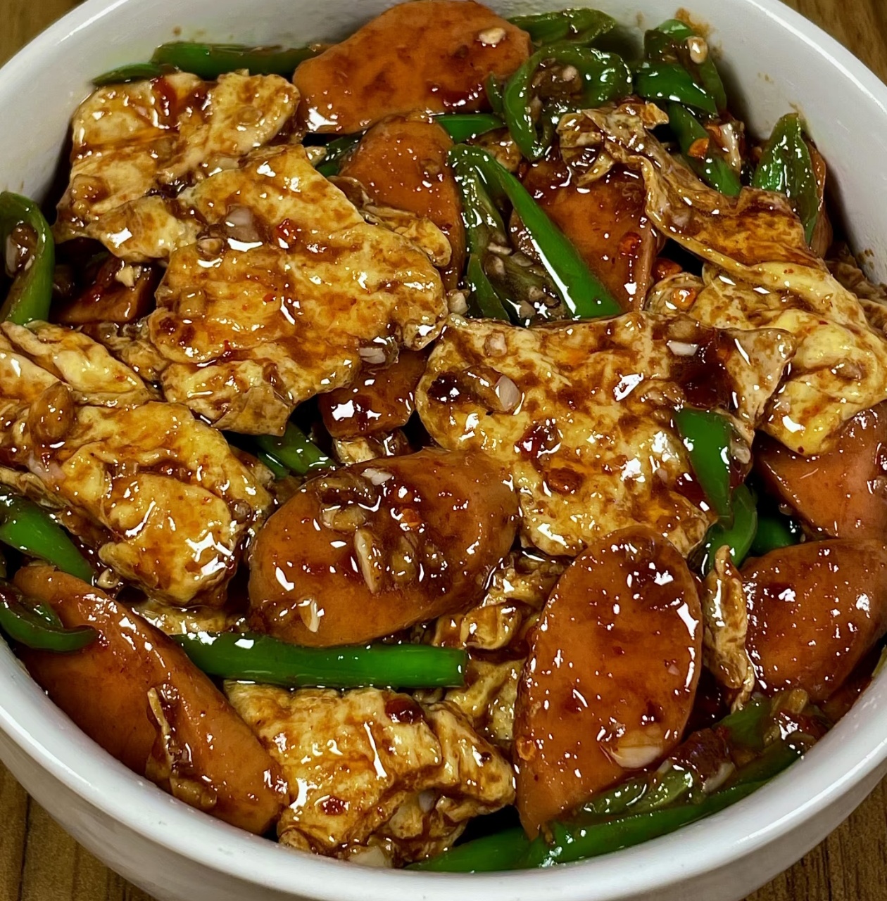 这道青椒火腿炒鸡蛋,没有复杂的工序,也没有昂贵的食材,却用最简单的搭配,做出了最治愈的家常味道。出锅的那一刻,浓郁的酱香混着青椒的清香飘满厨房,裹满酱汁的鸡蛋蓬松油亮,火腿带着焦香,青椒脆嫩爽口,光是看着就让人食指大动。它不只是一道快手家常菜,更是藏在烟火气里的温暖,不管是忙碌的工作日,还是懒得做饭的周末,这样一盘热气腾腾的炒菜,配上一碗白米饭,就能把疲惫都一扫而空,这大概就是家常菜最动人的地方,用简单的味道,就能治愈所有的日常。