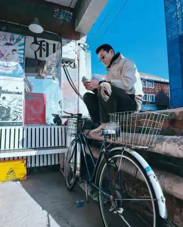 而且夫妻俩的街头拍,完全没有摆拍的痕迹,全是随手抓拍的自然瞬间:有时候是朱珠靠在路边的路灯旁,王昀佳站在她身边,两人低声说笑;有时候是夫妻俩并肩走在天津的街头,身后是挂满红灯笼和杨柳青年画的街巷,年味十足;还有时候,王昀佳在前面带路,朱珠骑着粉色电动车跟在后面,画面既可爱又接地气。