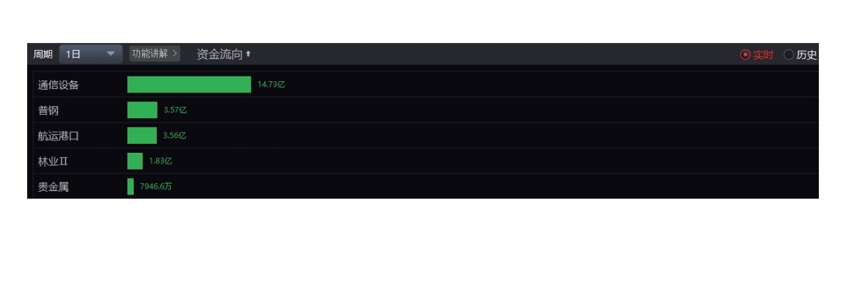 而早间资金净流出力度前五的行业板块依次为:通信设备、普钢、航运港口、林业、贵金属。其中,通信设备早间净流出额遥遥领先,资金短线兑利概率高企。今日上榜行业的早间净流出总额锐减,市场总体谨慎倾向边际改善。