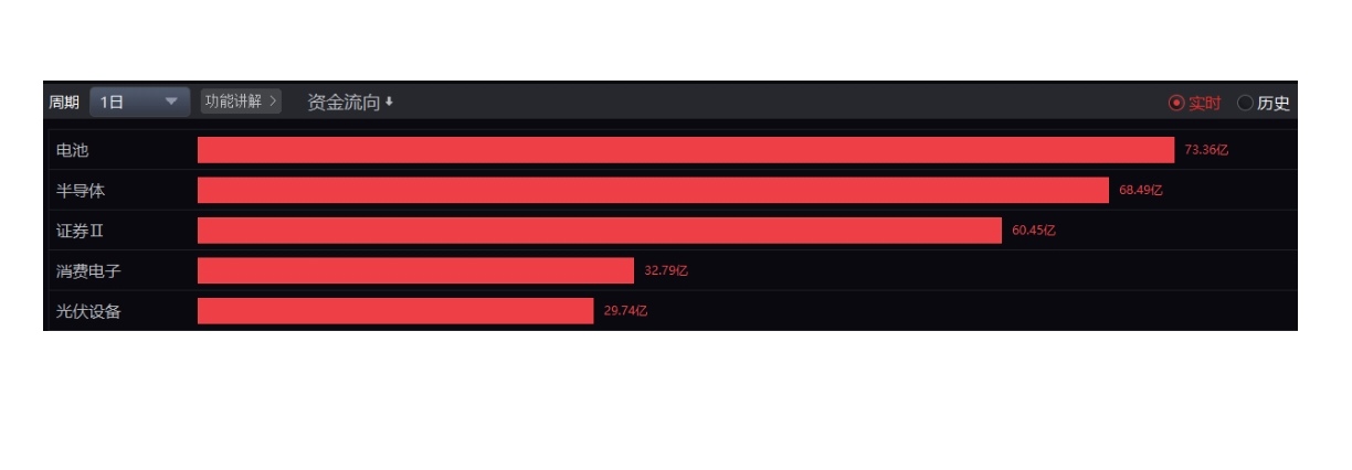 从软件提示的资金流向来看,截至今日午间收盘,资金净流入力度前五的行业板块依次为:电池、半导体、证券、消费电子、光伏设备。其中,电池行业早间净流入力度进一步提升,半导体持续获得资金关注加码,消费电子延续板块净流入领先表现;证券板块似有资金回流反攻迹象。早间上榜行业的总体资金净流入力度有所回升,但是资金关注方向似有分化倾向,盘面热点轮动或需持续关注。