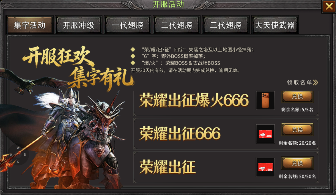 六大主题活动同步开启:集“荣/耀/出/征”字符可兑换iPhone、京东卡等实物及顶级游戏道具;开服冲级赛、翅膀合成挑战、大天使武器争夺等活动,名列前茅者可获专属称号、高阶装备宝箱。专属礼包码“ssvip777”“ssvip888”“ssvip999”,进服兑换即享助力道具。