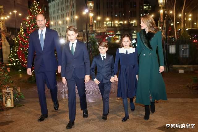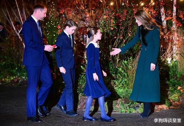 着装方面,12 岁的乔治与 7 岁的路易统一以深色西装亮相,干练又正式;10 岁的夏洛特则身着一袭节日感十足的丝绒连衣裙,搭配深色紧身裤,尽显优雅气质,与母亲凯特的造型相得益彰。在场外,他们受到了民众的热烈欢迎,面对镜头频频微笑挥手,夏洛特还不时牵起路易的手,乔治则主动帮妹妹整理裙摆,兄妹间的默契互动瞬间融化人心。