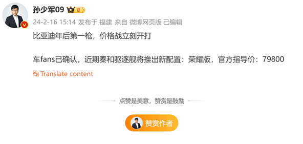 2024年春节假期还没结束,比亚迪就传出了开启新一轮价格战的消息。具体就是比亚迪秦PLUS DM-i和驱逐舰(这两车互为换壳)都推出的名为荣耀版的新配置,定价为7.98万。
