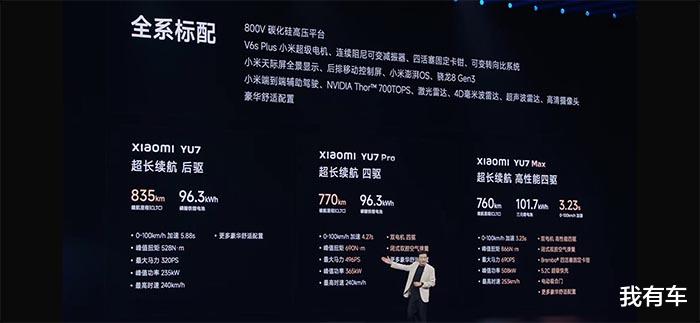 小米YU7的高功率版车型主打的是性能,系统综合功率508kW,百公里加速时间3.23秒,匹配容量为101.7kWh三元锂电池组,CLTC纯电续航里程760km,不过考虑到这台车的电池容量是真的不低,所以车价上也有可能会比SU7高配车型要高出不少。