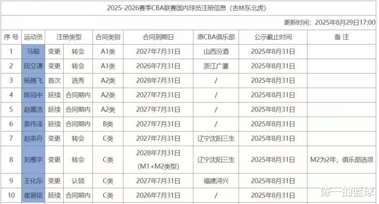 (长春,2025年8月29日) CBA新赛季注册窗口关闭前夕,吉林东北虎男篮率先抛出"王炸级"引援官宣!今日CBA官网更新注册信息显示,吉林队一次性完成10人注册,其中两大国手级新援赵率舟、刘雁宇的加盟引发热议,搭配姜伟泽的续约留队,这支传统劲旅的阵容深度堪称联盟顶级。