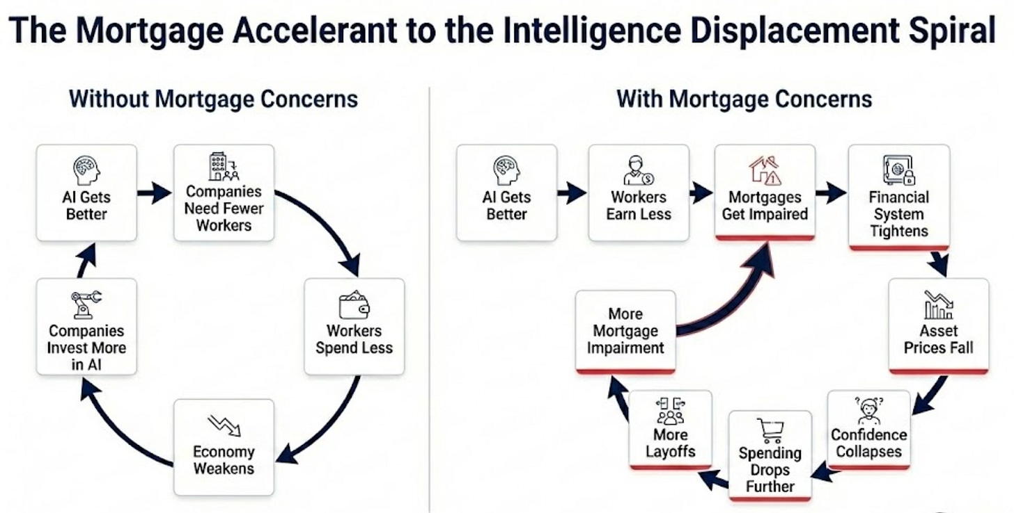 这是一个没有天然刹车的负反馈循环。人类智能替代螺旋。白领的收入能力(以及理性下的消费)遭到结构性损伤。他们的收入支撑着约 13 万亿美元的按揭市场——这迫使承保人重新评估“优质按揭”是否仍然安全。