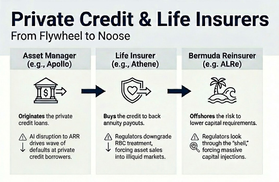 亏损冲击打到了那些为了对付长期负债而持有非流动资产的资产负债表上。原本应该让系统有韧性的“永久资本”,并非抽象的耐心机构资金,而是美国家庭的储蓄——“主街”的年金,这些年金投资在现在违约的 PE 支持的软件与科技资产上。无法抽离的资金是寿险保单持有人的钱,而那里的监管规则又有所不同。