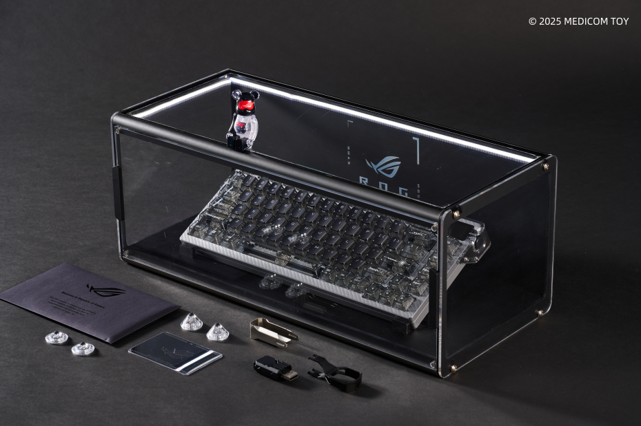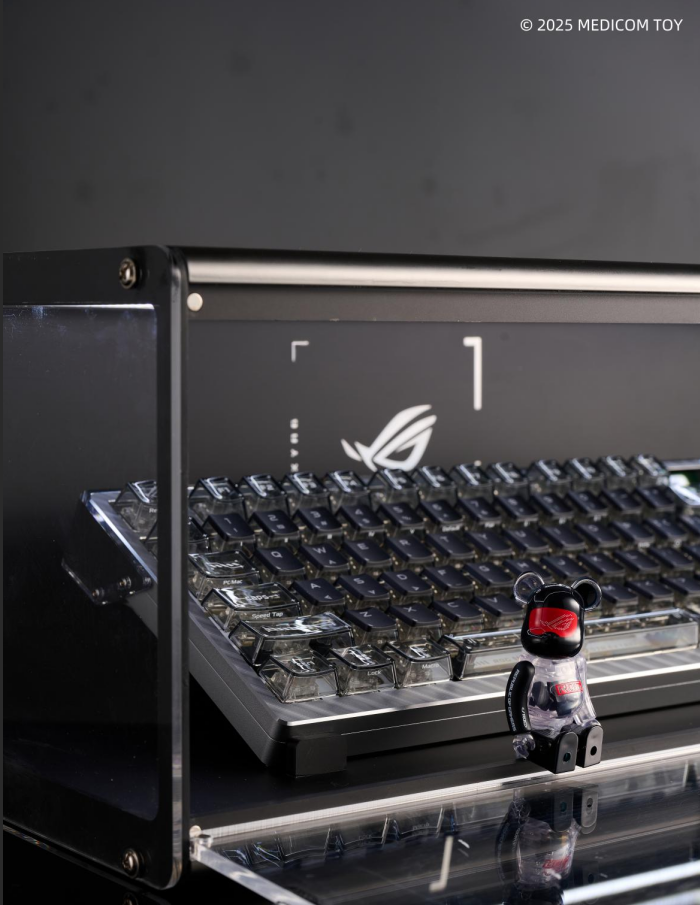 限定版包含了ROG夜魔EX SE机械键盘、ROG收藏展示盒和ROG×BE@RBRICK 100% size手办。其中,ROG夜魔EX SE机械键盘作为该套装的灵魂单品,凭借高颜值和出色性能成为玩家首选。