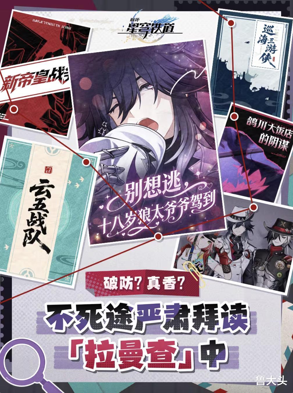 崩铁还不单单整活改编这些经典,甚至连自己都没放过。在不死途的物料中,就有他品鉴别人给他写的同人小说这一环,其中有一本《别想逃,十八岁狼太爷爷驾到》,这书名很有网文那味了。前段时间网文都在整崩铁的活,现在崩铁反过来用网文书名整活,制作组是懂双向奔赴的(bushi)。