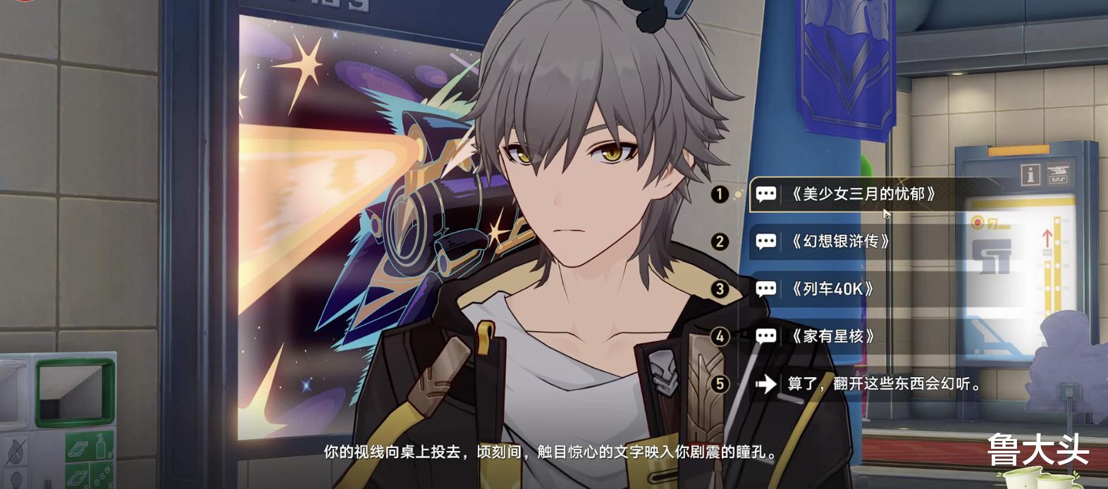 在游戏内FES上有个同人摊贩,也就是写同人小说的,这算是线下漫展的必备环节,只不过崩铁官方的同人小说书名有够雷霆的,文案也是很懂,用“触目惊心”来形容书名,不翻开的选项是看了会幻听。