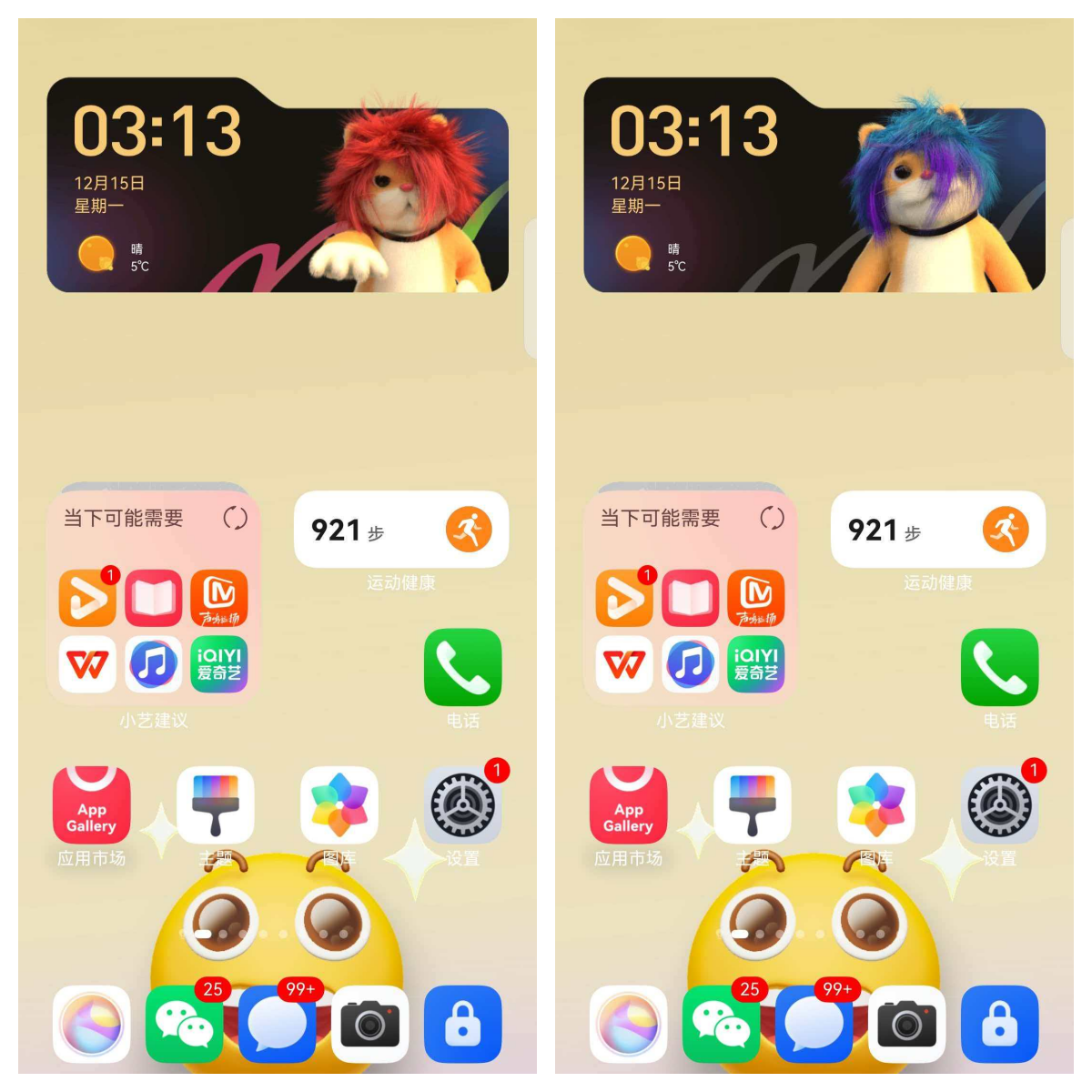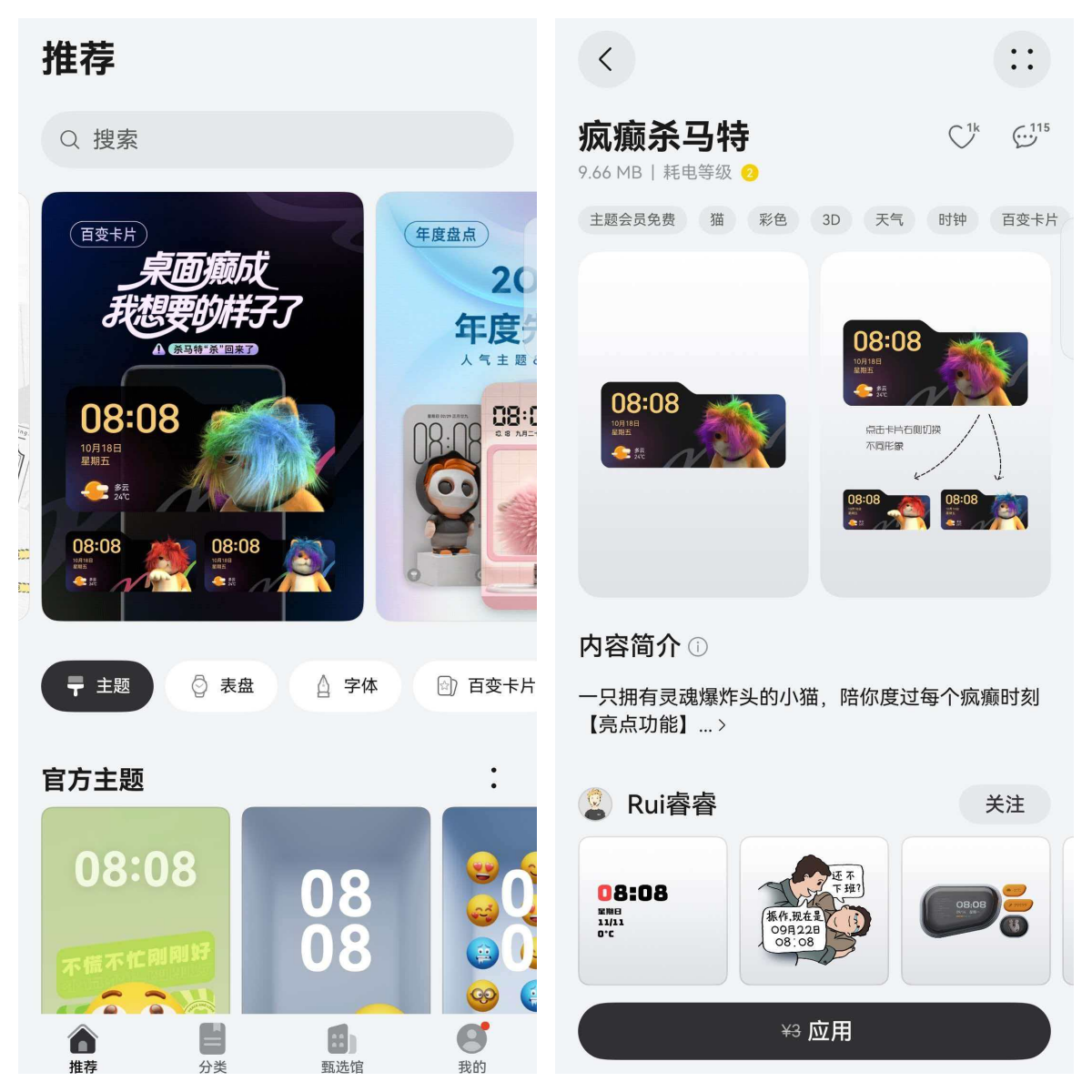 这只顶着彩虹色爆炸头的小猫,真的太有梗了。作为华为主题APP上新的百变卡片,它支持点击互动,桌面点击卡片侧边,这只猫就能切换不同的“疯癫”形象,每次解锁屏幕看到它那不羁的眼神,瞬间感觉“班味儿”都淡了,主打一个以毒攻毒的自我调节。