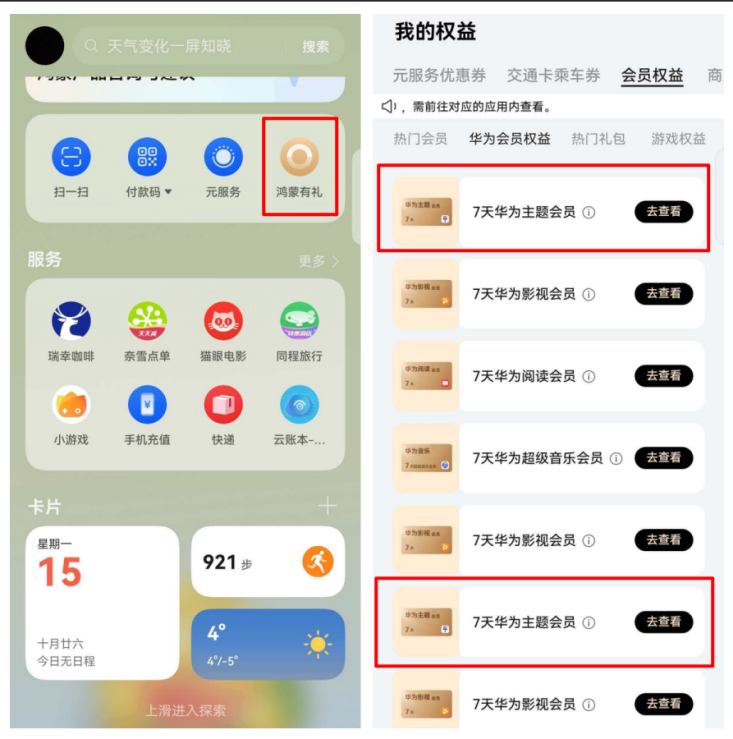 最关键的是,换这个主题我没花钱!因为我刚好赶上前阵子手机系统升级到HarmonyOS 6,桌面右滑负一屏进入“鸿蒙有礼”活动就签到打卡,除了可以领现金红包之外,还有机会领到随机会员权益,比如我就幸运的抽到了7天华为主题会员,正好拿来体验这个百变卡片。