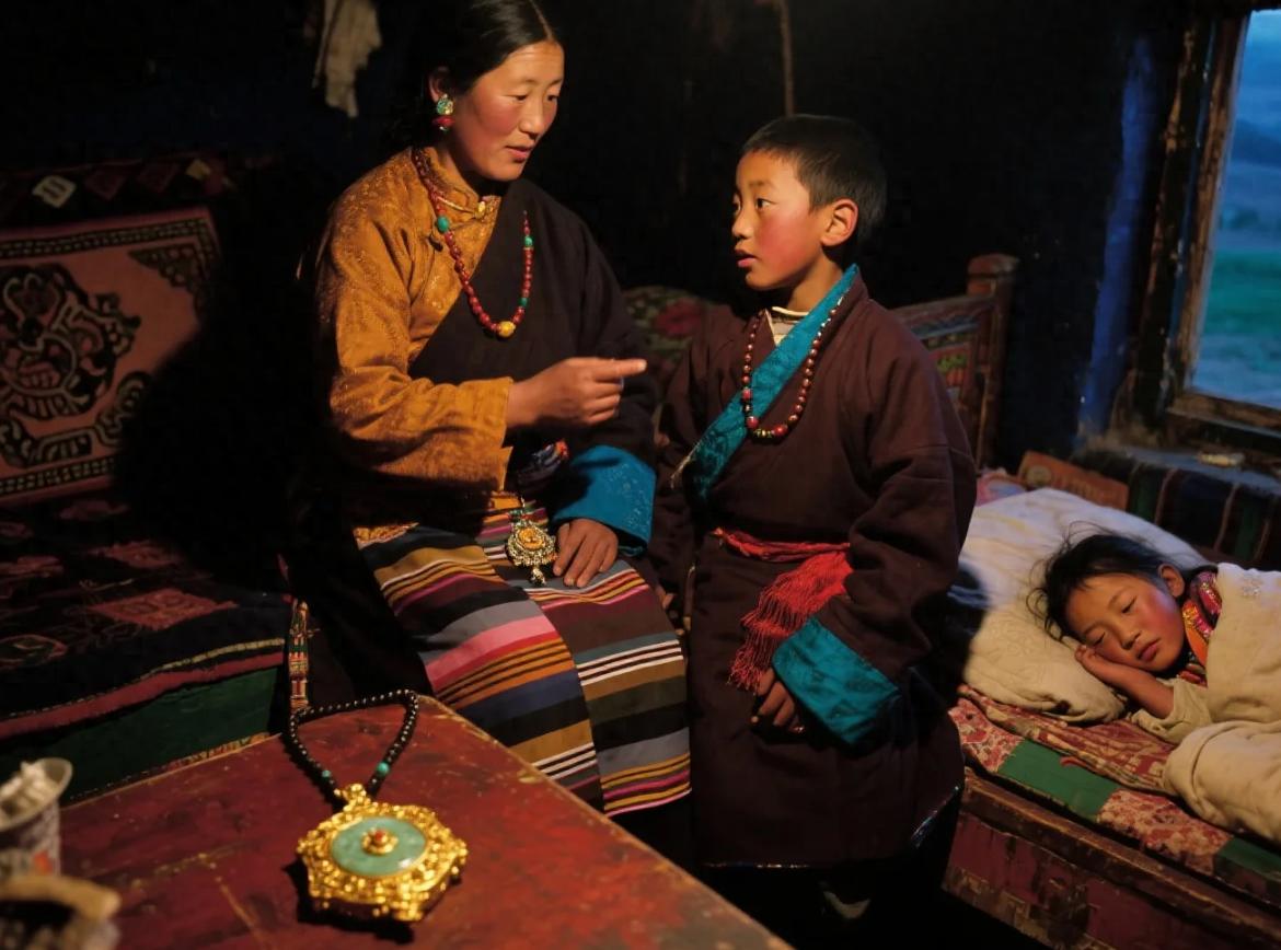 藏族妇女恭敬地对喇嘛行礼,然而当她得知少年的身份后,激动得不能自已,跌跌撞撞地翻出家里最好的食物和钱财摆在少年面前,接着匍匐跪倒在少年身前,恳请少年接受。