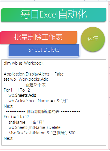 代码Sub DeleteSheets()Dim wb As WorkbookApplication.DisplayAlerts = FalseSet wb = Workbooks.Add'----------- 新建12个表 -------------------For i = 1 To 12 wb.Sheets.Add wb.ActiveSheet.Name = i & "月"Next' ----------- 删除刚刚新建的表 -----------For i = 1 To 12 shtName = i & "月" wb.Sheets(shtName).Delete MsgBoxEx shtName & "已删除", 500NextEnd Sub