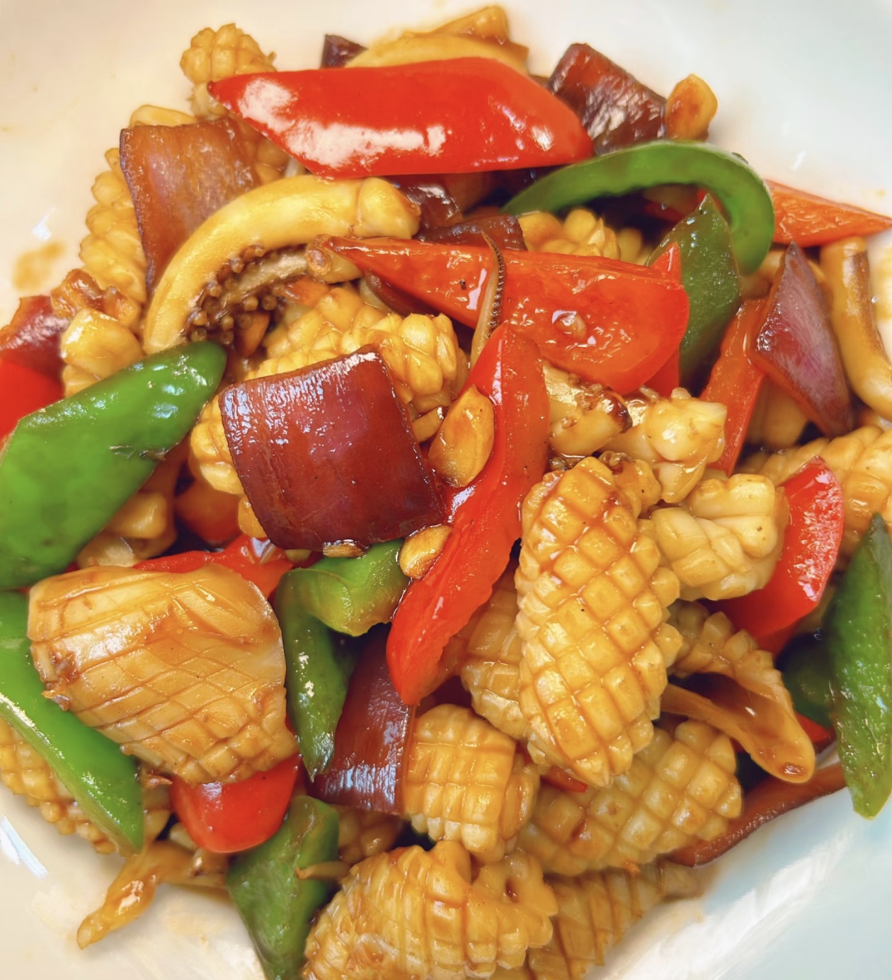 装盘后的酱爆鱿鱼,红亮的酱汁包裹着卷成漂亮形状的鱿鱼,青红椒的翠绿、洋葱的紫褐与鱿鱼的乳白交织在一起,光是看着就让人食欲大开。夹起一块鱿鱼送入口中,弹牙的口感在舌尖迸发,鲜美的鱿鱼滋味混合着酱汁的咸香、番茄酱的酸甜,还有青红椒和洋葱的清爽,层次丰富又恰到好处。