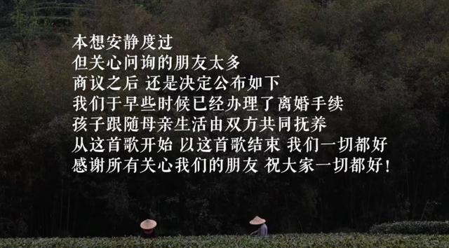一段背景为采茶照片的视频,配上:我们已于早些时候办理离婚手续,孩子将随母亲生活。的文案。
