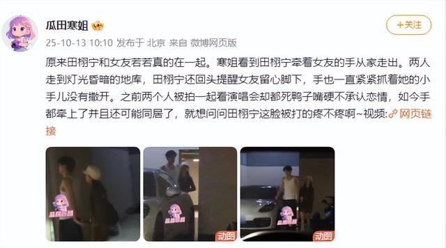 10月13日,狗仔曝光的视频显示,田栩宁身着背心短裤、素颜出镜,与一女子从同一住宅地下车库牵手走出。