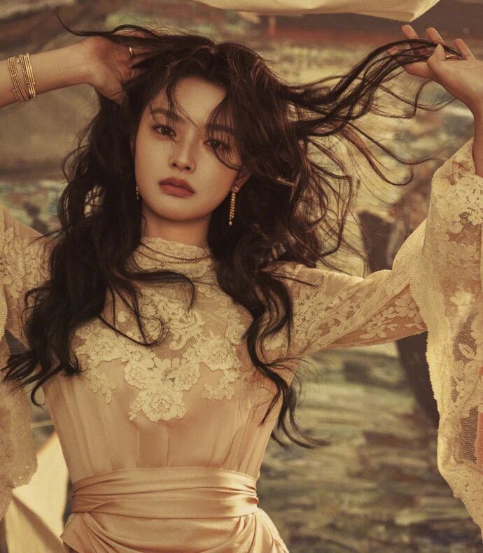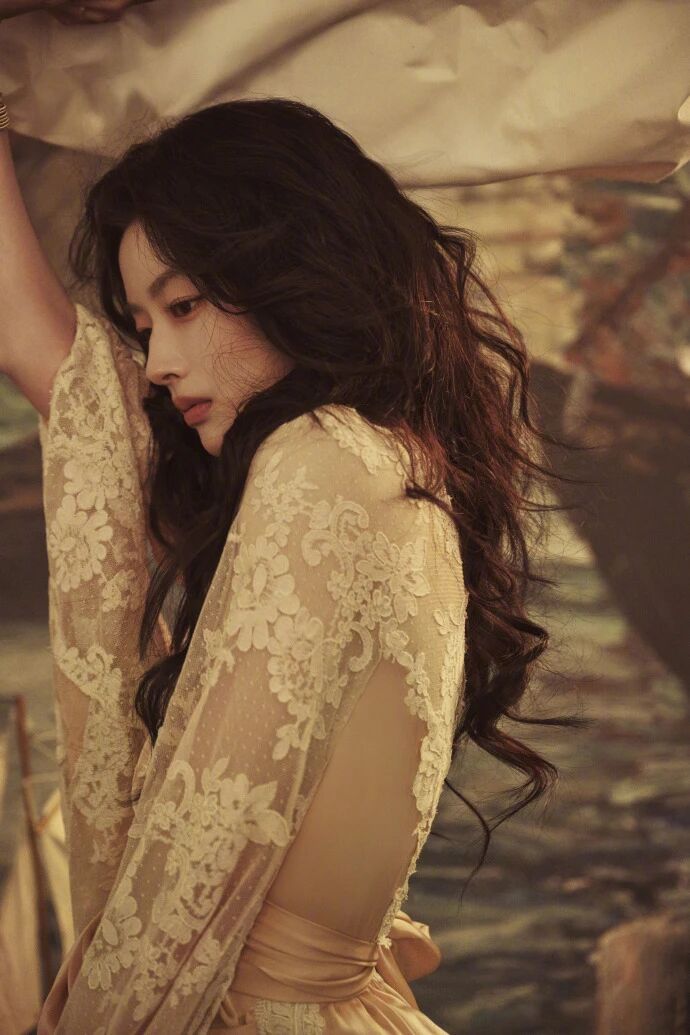 :不是 “垮满全身的波西布”—— 纱褶是 “柔而有骨”,像裹在肩峰上的帆影纹,顺着骨相的起伏垂,没糊成 “压身的堆”;收腰的缝是 “收而不勒”,卡在腰棱的弧度上,把身形衬得 “甜而不垮”,金句:“波西米亚的高级从不是‘堆裙堆饰’,是‘纱褶的柔顺着你的骨甜,卷发的懒裹着你的韵风’—— 徐若晗这波,是把 Zimmermann 的纱,揉成了清甜骨相里的帆”。卷发的 “软边裹韵”