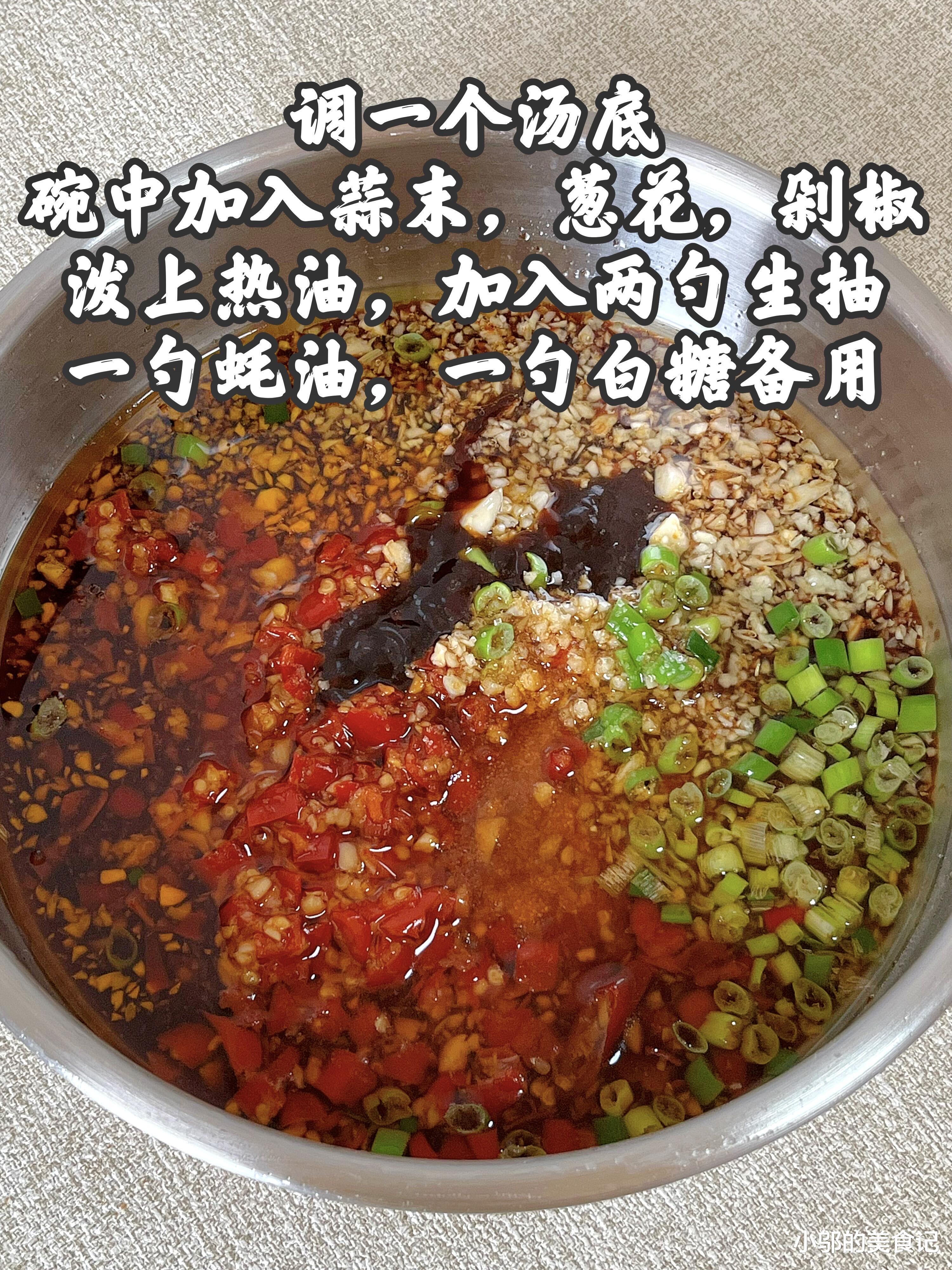 做剁椒拌面,灵魂全在这碗“万能酱汁”里。准备一个耐热的碗,放入两勺蒜末、一勺葱花、两大勺剁椒——剁椒是这道面的“灵魂”,它的咸鲜和微辣能瞬间激活味蕾,没有的话用新鲜红辣椒剁碎加少许盐腌制10分钟也能替代。烧一勺热油(油温七成热,微微冒烟即可),淋在蒜末、葱花和剁椒上,“刺啦”一声,香味瞬间被激发出来,蒜香、葱香和剁椒的辣香混合在一起,闻着就让人流口水!加入两勺生抽提鲜增咸,一勺蚝油增加醇厚感,一勺白糖中和辣味、提升鲜甜,用勺子充分搅拌均匀,直到白糖完全溶解,酱汁呈红棕色、质地浓稠就成功了。这碗酱汁的精髓在于“香辣咸鲜”的平衡,剁椒的辣、生抽的咸、蚝油的鲜、白糖的甜,加上热油激发的香气,组合在一起就是“一口上头”的拌面底,不管是拌面条、米饭还是拌菜,都超好吃!