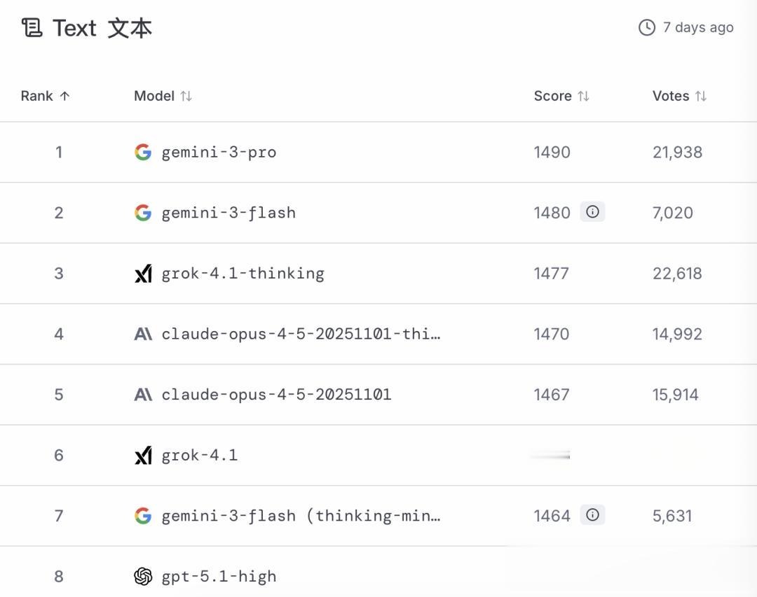 7天前的总分榜单,Gemini-3-pro稳居榜首