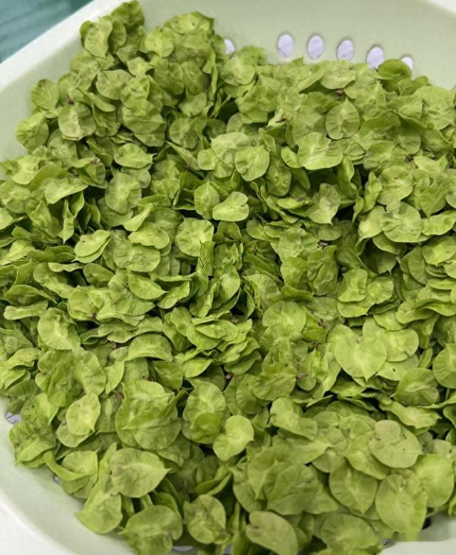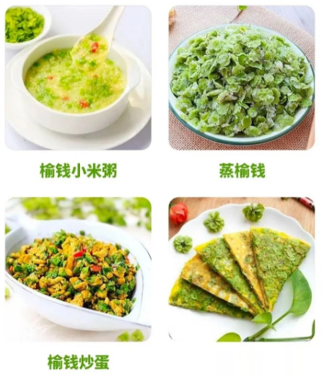 榆钱炒鸡蛋:热油锅打个笨鸡蛋,快熟时撒把榆钱,黄配绿非常诱人;
