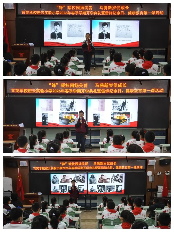 雷锋的故事,跨越时空温暖人心;雷锋的精神,代代相传永不褪色。四、五、六年级的少先队员代表依次登台,分阶段讲述雷锋从少年队员、工厂学徒到解放军战士的成长故事。一个个感人的片段,一声声真挚的讲述,让全体师生再次走近雷锋,深刻感悟他乐于助人、甘于奉献、爱岗敬业的崇高精神。